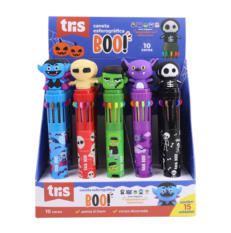 Produtos que transformam a sala de aula em um caldeirão de criatividade. A caneta esferográfica Boo! possui toppers