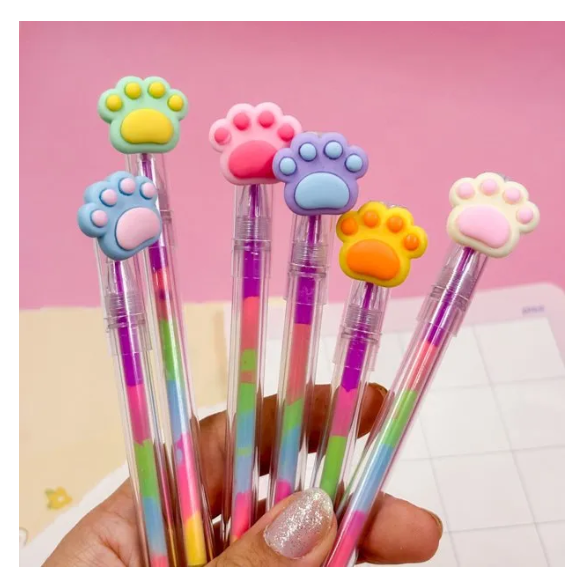 Caneta Fofa com tinta colorida, que vai descendo e mudando de cor conforme se escreve. Com Biscuit de Patinhas fofas na tampa.