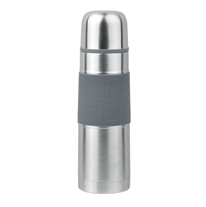 Garrafinha térmica inox com copo dosador e botão sistema "Fast Click", permite servir sem abrir a garrafa o que ajuda a manter a temperatura interna.